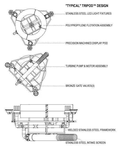 The TriPod floating pond fountain creates a striking water feature with three distinct, rising streams. Each stream measures 8 inches in diameter, offering a substantial visual impact. You can adjust the flow of each stream on-site, allowing for a personalized water display that suits your pond or lake. This floating fountain system includes a UL listed control panel and a robust submersible turbine pump. Both components are built to last, using premium, corrosion-resistant materials for reliable operation and long-term performance.